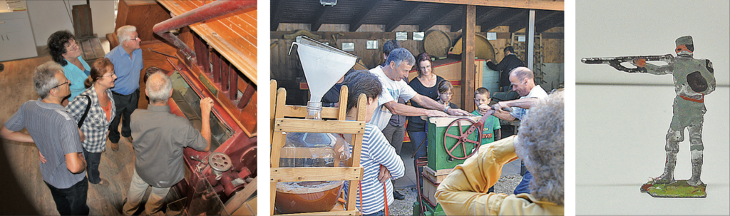 Im Heimatmuseum hingegen herrscht Handbetrieb, das Rad der alten Obstpresse dreht sich mit körperlichem Krafteinsatz. Jung und Alt sind zum Drehtest eingeladen oder auch nur das Resultat zu geniessen in Form eines Glas frischgepressten Mostes. Zum Aufsaugen stehen Speck und Brot bereit. Gestärkt lässt sich nun den Ausführungen vom Zinnsoldatenexperten Peter Mäder folgen. Als Spezialist vom Landesmuseum wird er endlich die Schlachtordnung im «Teutoburger Walde» und weiterer Tablaux aus der Sammlung des ehemaligen Bezirkslehrers Eduard Gerber in die korrekte Aufstellung bringen und erklären können.