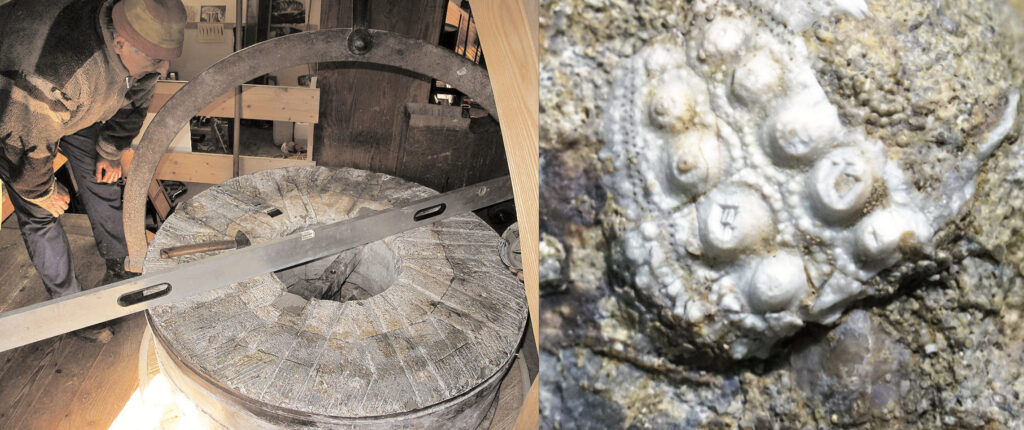 In der Mühle werden die Mahlwerke samt Zubehör auseinandergenommen und der jährlichen gründlichen Reinigung und Inspektion unterzogen. Dabei wird so manches Detail sichtbar, das sich sonst im kompakten Zusammenspiel versteckt hält. Auch die Mahlsteine präsentieren sich so in ihrer ganzen Pracht. Die Experten vor Ort erklären die Funktionen der Teile in Arbeit.