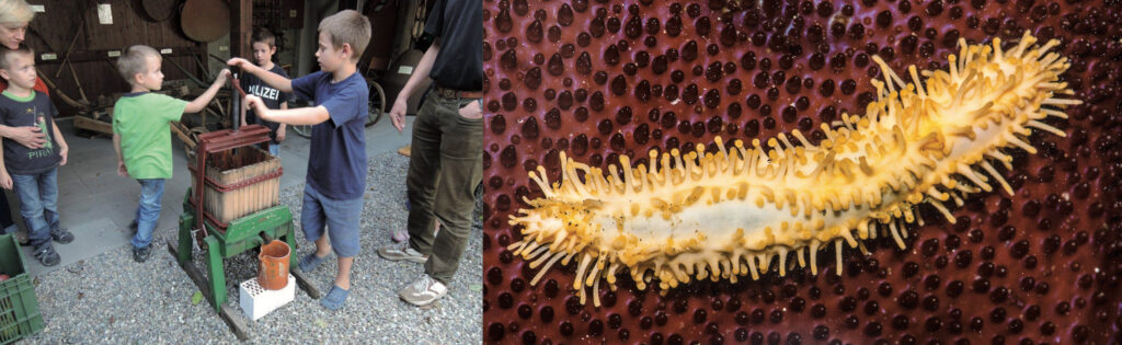 Verschiedene Apfelsorten können getestet werden, Speck und Brot bödelen den Magen. Dann sind alle Sinne gerüstet, die Schätze des Museums auszuloten, die weit länger zurückreichen als bis zum letzten Sommer. Der Film von Emil Hartmann und Hansruedi Gysi führt uns über alle Jahreszeiten zurück ins alte Schinznach. Die Tafeln in der Ausstellung zum Rebbau zeigen drastisch die Auswirkung der Reblaus auf das Rebbaugebiet vor vier Generationen und die Rebbauinstrumente daneben lassen die harte Arbeit erahnen, die auch aktuell noch nötig ist, bis die Trauben gekeltert werden können. Die Versteinerungen vom hiesigen Heister aber sind Zeugen einer Welt, die sich unserem Erinnerungsvermögen gänzlich entzieht und buchstäblich versunken ist im Meer, das vor 165 Millionen Jahren das Gebiet von Schinznach bedeckt hat. Eine Spezialausstellung zeigt die eindrückliche Stachelhäutersammlung mit Stücken, die auch ohne unangenehme Folgen in die Hand genommen und unter der Lupe inspiziert werden dürfen – die fossilisierten Tiere, die Seeigel , Seesterne und Seelilien zeigen nur noch ihre Schönheit und stechen nicht mehr. Die verwandten Seewalzen aber sind kaum versteinert erhalten, da ihr Skelett auf wenige Kalkelemente reduziert ist – und doch gibt es einen raren Abdruck im Heimatmuseum zu sehen.