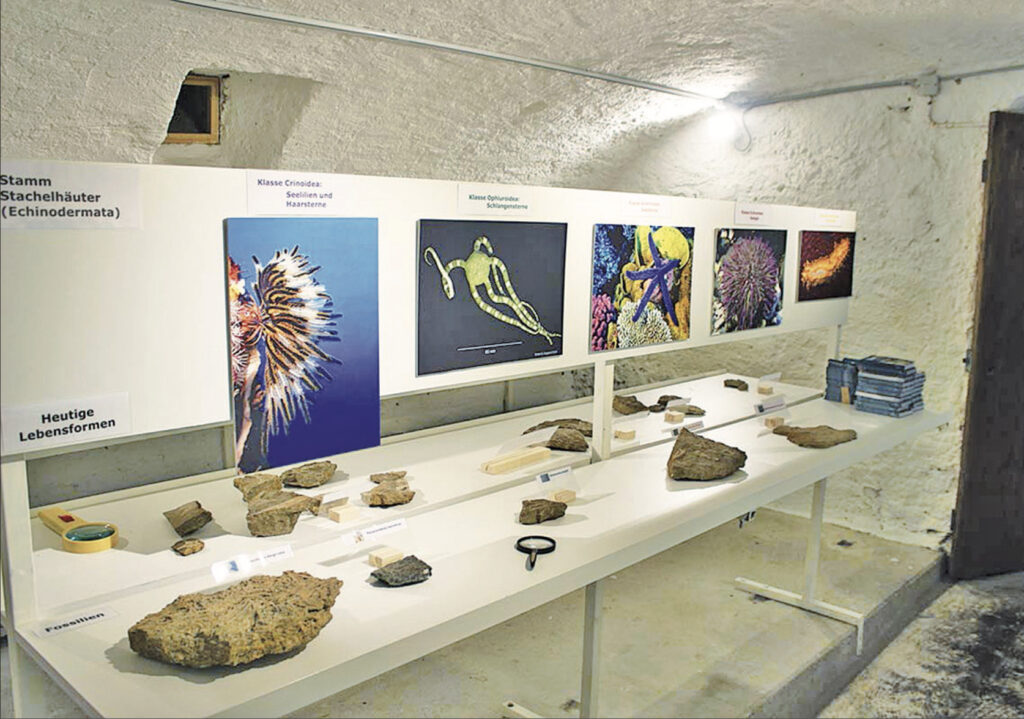 In die Ferne und in die Tiefe ziehen die Fotografien den Besucher im neu eingerichteten Kellergewölbe. Sie reprĂ€sentieren die jungen, modernen Formen von StachelhĂ€utern in ihrer ganzen Pracht umgeben von ihren alten fossilen Vorfahren. Die Versteinerungen verblĂŒffen zwar nicht mehr mit ihrer FĂ€rbung, wohl aber mit der VollstĂ€ndigkeit ihrer zarten Skelette. Die Exemplare dĂŒrfen durchaus in die Hand genommen und mit der Lupe studiert werden. Wie kommt es , dass gerade hier im Heistersteinbruch ob dem heutigen Schinznach eine einmalige Fundstelle mit diesen wohlerhaltenen Versteinerungen sĂ€mtlicher fĂŒnf StachelhĂ€uterklassen liegt? Das Jurameer, das sich vor 165 Millionen Jahren hier befunden hat (wie die neue Zeitreisetafel prĂ€chtig illustriert), war wohl nicht nur lauwarm, sondern auch untief und sanft. Ein Ferienmeer.