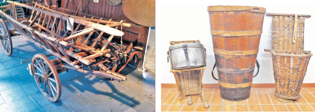 Links: Auch ein gut erhaltener Leiterwagen ist im Schinznacher Museum ausgestellt. Rechts: Verschiedene Brenten sind im Museum zu bewundern.