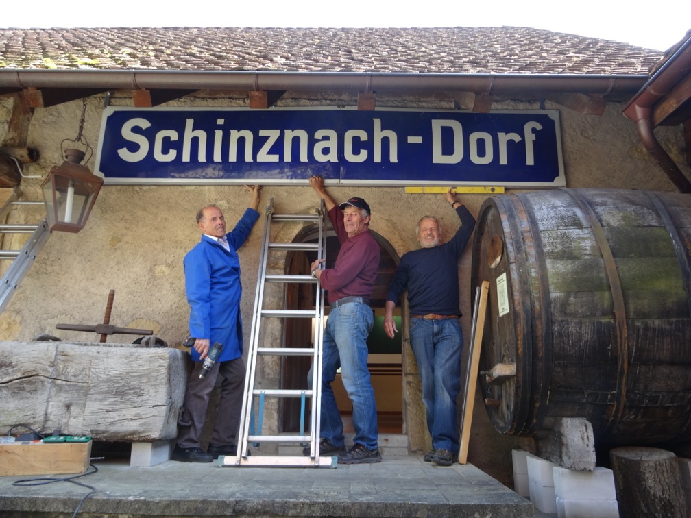 Bereits im Hof des Museums empfĂ€ngt die Bahnhofsglocke der SchBB (Schinznacher Baumschul–Bahn) den Besucher und gibt den Ton an zum Thema der diesjĂ€hrigen Sonderausstellung. Mit der Eröffnung des Gotthardtunnels muss sich nun eben auch der Bözbertunnel anpassen und erneuert werden. Der weit ĂŒber hundert Jahre alte Bahnhof von Schinznach-Dorf wird weichen mĂŒssen. Allerdings ist er in seiner ganzen Pracht, im VerhĂ€ltnis 1:87 als Modell von Gregor Tomasi erschaffen, in der Spezialvitrine vom Heimatmuseum nochmals zu bewundern – ein Kleinod, das in Funktion gezeigt wird samt Bahnpersonal, das mit dem GĂŒterumschlag beschĂ€ftigt ist, mit wartenden Velos, die bis zur Speiche das LebensgefĂŒhl im alten Bahnhof vermitteln. In «natĂŒrlicher Grösse» scharen sich darum herum, was das BĂ€hnlerherz höher schlagen lĂ€sst: von der alten Bahnhofskelle, ĂŒber die rote Kondukteurtasche bis zum Billettautomaten. Der ehrwĂŒrdigen Kartonbillett-Apparat ist schon an und fĂŒr sich ein Kunstwerk und seine FunktionstĂŒchtigkeit durchaus intakt, wie sich Jung und Alt selbst ĂŒberzeugen kann. Dokumente zur Schinznacher Bahnhofsgeschichte, die mit Bau des ersten Bözbergtunnels verknĂŒpft ist, illustrieren das Ende dieser spezifischen Ära und ein SBB-Film zeigt die grossencZusammenhĂ€nge der Entstehung des Schweizerischen Eisenbahnnetzes.